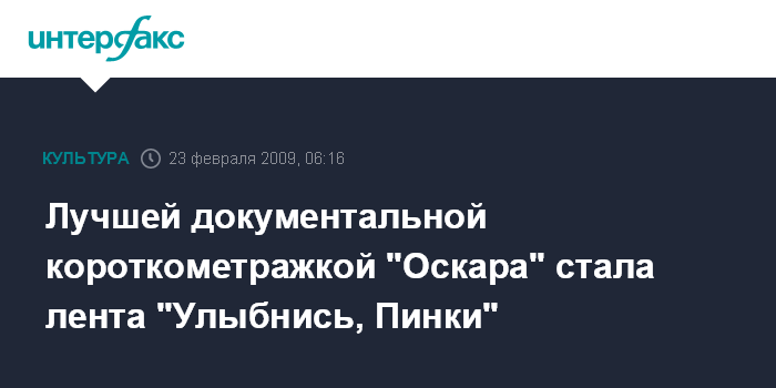 Москва. 23 февраля. INTERFAX.RU - Победителем в номинации Лучшая короткометражная документальная лента стал фильм "Улыбнись, Пинки".