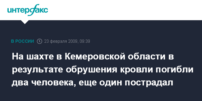 Москва. 23 февраля. ИНТЕРФАКС - Два человека погибли в результате аварии на шахте имени Дзержинского в городе Прокопьевске Кемеровской области, сообщил "Интерфаксу" в понедельник источник в правоохранительных органах региона.