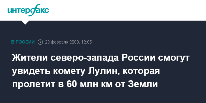 Санкт-Петербург. 23 февраля. INTERFAX.RU - Жители северо-западной части России смогут наблюдать в ночь на 25 февраля комету Лулин, которая пролетит над Землей на расстоянии 60 млн километров, заявил журналистам пресс-секретарь Главной астрономической обсерватории РАН в Петербурге Сергей Смирнов.