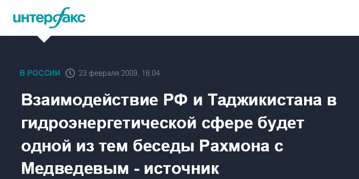 Взаимодействие РФ и Таджикистана в гидроэнергетической сфере будет одной из тем беседы Рахмона с Медведевым - источник
