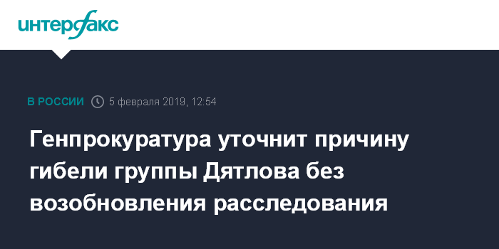Москва. 5 февраля. INTERFAX.RU - В Генеральной прокуратуре РФ опровергли сообщения ряда СМИ о том, что прокуроры якобы возобновили расследование уголовного дела по факту гибели в 1959 году на Северном Урале так называемой "группы Дятлова".