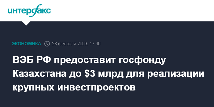 ВЭБ РФ предоставит госфонду Казахстана до $3 млрд для реализации крупных инвестпроектов