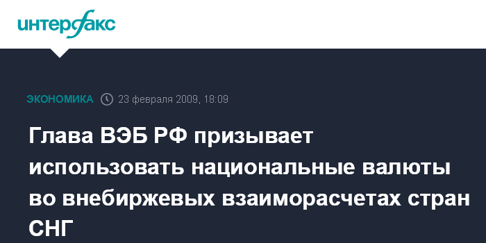 Астана. 23 февраля. INTERFAX.RU - Глава Внешэкономбанка (ВЭБ) РФ Владимир Дмитриев считает, что использование во взаимных расчетах стран СНГ национальных валют положительно скажется на укреплении этих валют.