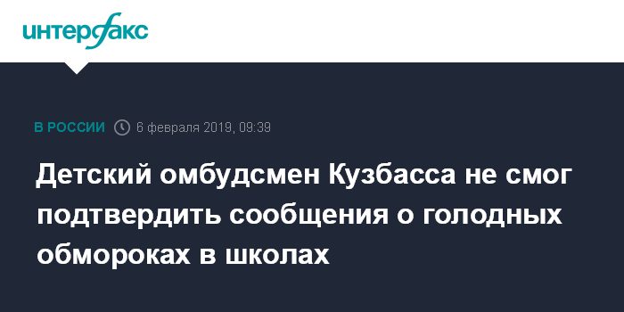 Москва. 6 февраля. INTERFAX.RU - Уполномоченный по правам ребенка в Кемеровской области Дмитрий Кислицын не обнаружил в школах региона подтверждения поступивших ему сообщений о голодных обмороках детей.