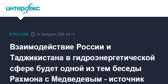Взаимодействие России и Таджикистана в гидроэнергетической сфере будет одной из тем беседы Рахмона с Медведевым - источник