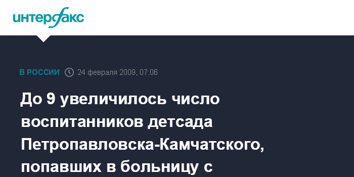 Еще двое воспитанников детского сада №51 в Петропавловске-Камчатском попали в больницу с подозрением на кишечную инфекцию, сообщила во вторник агентству "Интерфакс-Дальний Восток" заместитель градоначальника краевого центра Ирина Унтилова.