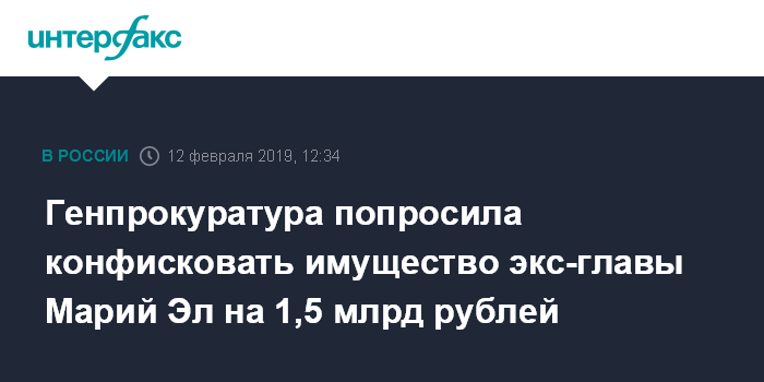 Москва. 12 февраля. INTERFAX.RU - Генпрокуратура направила в суд иск об обращении имущества на сумму 1,5 млрд рублей обвиняемого в коррупции экс-главы республики Марий Эл Леонида Маркелова в доход государства. Об этом сообщил официальный представитель ведомства Александр Куренной в ходе интернет-программы "Эфир" во вторник.
