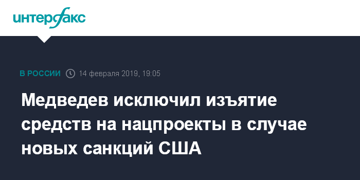 Москва. 14 февраля. INTERFAX.RU - Новые санкции США никак не отразятся на объеме средств, выделяемых на реализацию национальных проектов, заявил премьер-министр РФ Дмитрий Медведев.