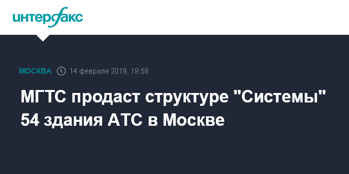 Москва. 14 февраля. INTERFAX.RU - МГТС продает компании "Бизнес-Недвижимость" (структура АФК "Система") 54 здания АТС в Москве, говорится в сообщении МГТС.