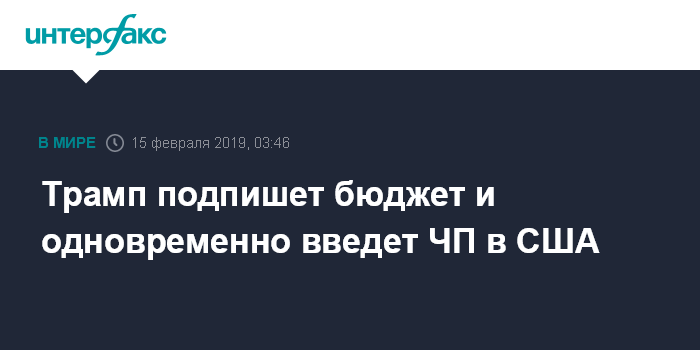 Москва. 15 февраля. INTERFAX.RU - Президент США Дональд Трамп намерен в пятницу подписать бюджет, касающийся финансирования госучреждений, и объявить о введении чрезвычайного положения (ЧП) в стране, сообщила пресс-секретарь Белого дома Сара Сандерс.