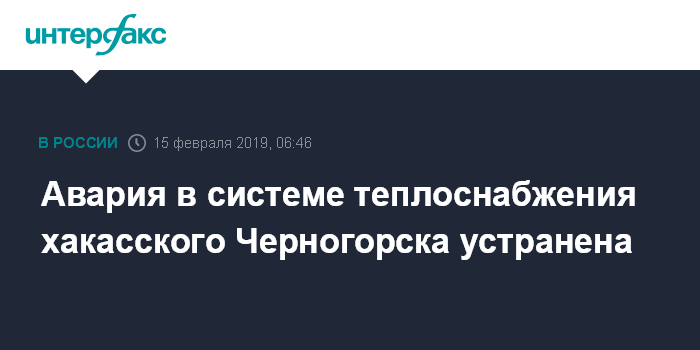 Москва. 15 февраля. INTERFAX.RU - Коммунальные службы Черногорска (Республика Хакасия) ликвидировали аварию, из-за которой десятки многоквартирных домов остались без тепла в морозную погоду, сообщает пресс-центр правительства региона в пятницу.
