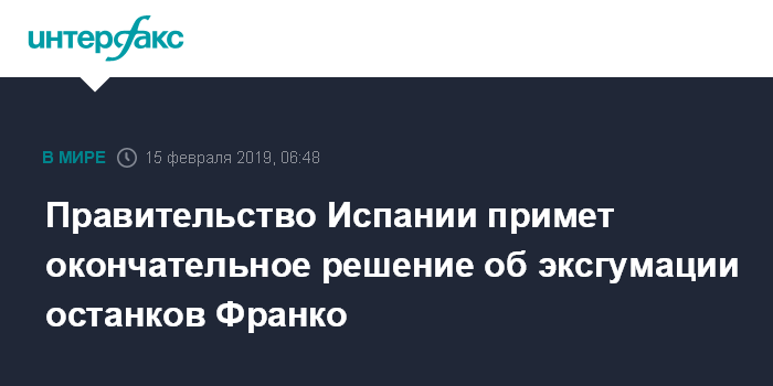 Москва. 15 февраля. INTERFAX.RU - Правительство Испании в пятницу примет декрет об эксгумации останков бывшего руководителя страны Франсиско Франко.