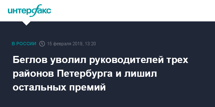 Москва. 15 февраля. INTERFAX.RU - Врио губернатора Санкт-Петербурга Александр Беглов принял отставку глав трех районов города, сообщает пресс-служба администрации губернатора.