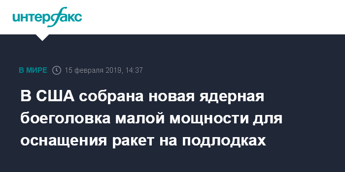 Москва. 15 февраля. INTERFAX.RU - В рамках новой ядерной стратегии Соединенных Штатов на предприятии Pantax в штате Техас произведена первая ядерная боеголовка малой мощности W76-2 для переоснащения части межконтинентальных баллистических ракет Trident II (D5) на стратегических атомных подлодках, сообщил представитель Национального управления по ядерной безопасности США.