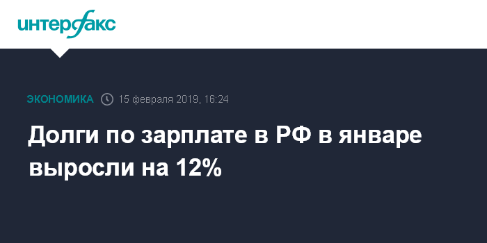 Москва. 15 февраля. INTERFAX.RU - Просроченная задолженность по заработной плате в России на 1 февраля 2019 года составила 2 млрд 711 млн рублей, увеличившись за январь на 291,1 млн рублей, или на 12%, сообщил в четверг Росстат.