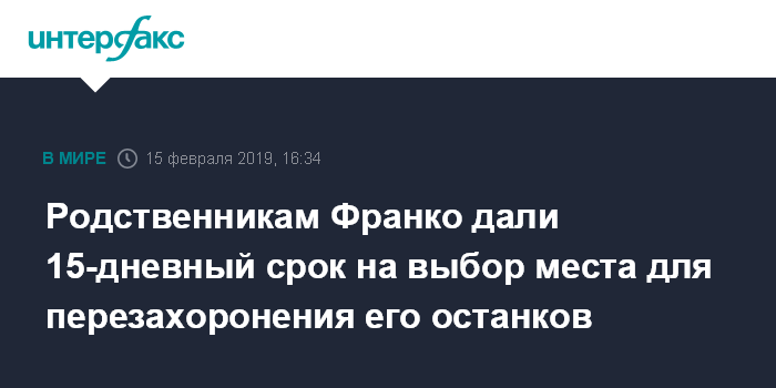 Москва. 15 февраля. INTERFAX.RU - Правительство Испании предоставило в пятницу семье бывшего руководителя Испании Франсиско Франко 15-дневный срок на принятие окончательного решения о месте его перезахоронения после эксгумации останков из могилы в Долине Павших.