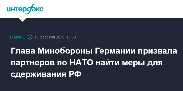 Москва. 15 февраля. INTERFAX.RU - Министр обороны Германии Урсула фон дер Ляйен заявила в пятницу о важности сохранения сути Договора о ликвидации ракет средней и меньшей дальности (ДРСМД), а также о поиске партнерами по НАТО правильного комплекса мер для сдерживания России.