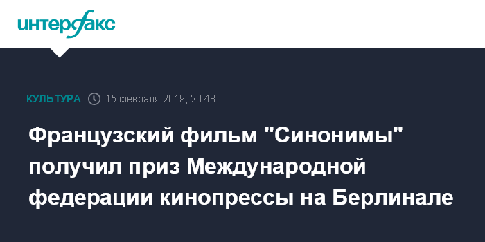Москва. 15 февраля. INTERFAX.RU - Французский фильм израильского режиссёра Надава Лапида "Синонимы" получил в пятницу на Берлинале приз Международной федерации кинопрессы (ФИПРЕССИ) за "тонкий политический посыл".