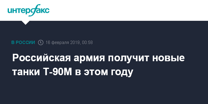 Москва. 16 февраля. INTERFAX.RU - Вооруженные силы России в текущем году начнут получать новые танки Т-90М, сообщил "Интерфаксу" информированный источник.