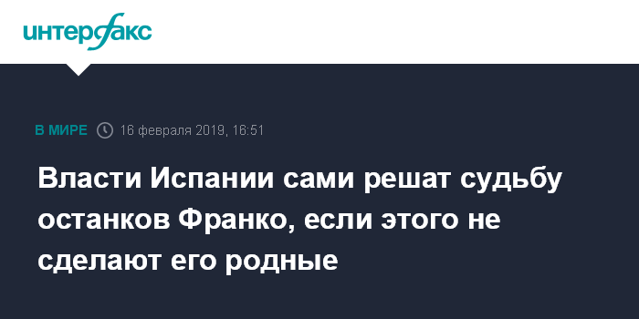 Москва. 16 февраля. INTERFAX.RU - Дальнейшую судьбу останков бывшего руководителя Испании Франсиско Франко в случае, если его родственники не выберут место для его перезахоронения, будет определять испанское правительство, сообщает в субботу телеканал TeleMadrid.