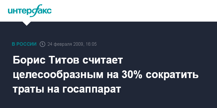 Москва. 24 февраля. INTERFAX.RU - Председатель "Деловой России" Борис Титов предлагает в условиях кризиса сократить на 30% расходы на госаппарат и отказаться от масштабных проектов строительства объектов на острове Русский к саммиту АТЭС в 2012 году.