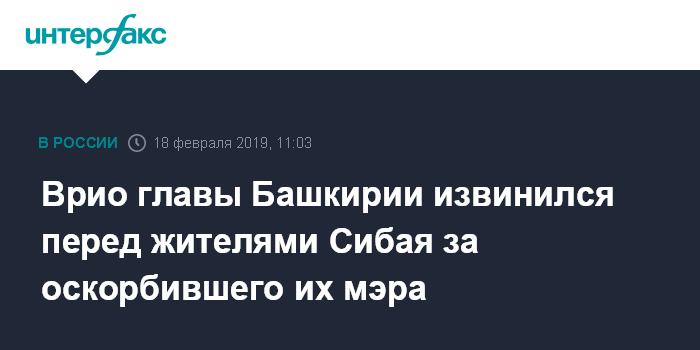 Москва. 18 февраля. INTERFAX.RU - Врио главы Башкирии Радий Хабиров принес публичные извинения жителям города Сибай, в адрес которых ранее допустил резкие негативные высказывания мэр города Рустем Афзалов.