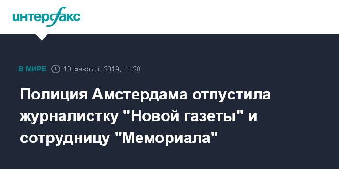Москва. 18 февраля. INTERFAX.RU - Журналистку "Новой газеты" Елену Милашину и сотрудницу правозащитного центра "Мемориал" Милану Бахаеву отпустили из отделения полиции в аэропорту Амстердама, сообщила "Интерфаксу" пресс-секретарь издания Надежда Прусенкова.