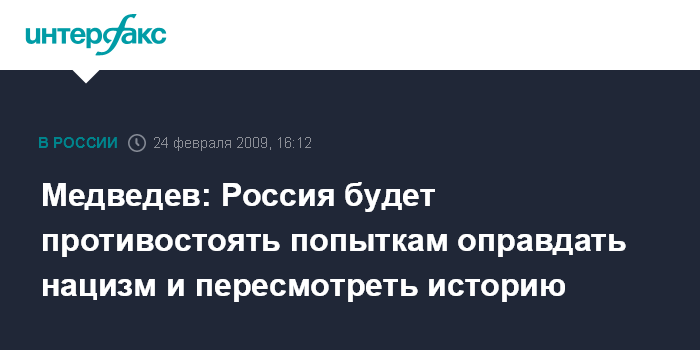 Москва. 24 февраля. INTERFAX.RU - Президент РФ Дмитрий Медведев считает недопустимыми попытки оправдать нацизм, и заявляет, что Россия будет противостоять этому.