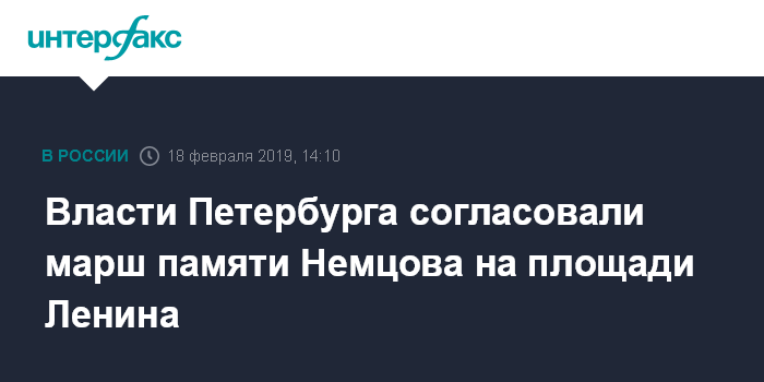 Москва. 18 февраля. INTERFAX.RU - Власти Санкт-Петербурга согласовали проведение марша памяти Бориса Немцова на площади у Финляндского вокзала 24 февраля, сообщили организаторы мероприятия в понедельник.
