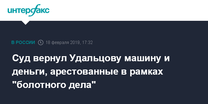 Ранее в "Левом фронте" агентству сообщили, что "Сергей Удальцов обратился в Московский городской суд с ходатайством, в котором просит вернуть ему имущество - денежные средства и автомобиль, арестованные еще в 2012 году в ходе расследования так называемого "болотного" дела в качестве обеспечения возможных гражданских исков".