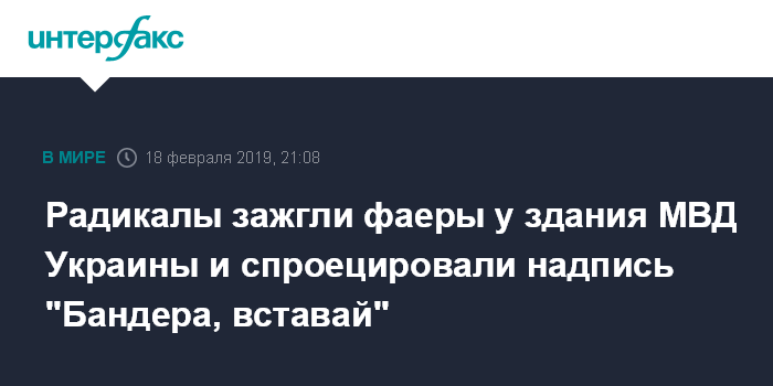 На подходах к МВД протестующие подожгли фаеры, а, придя на место, направили на фасад здания МВД из проектора надпись "Бандера, вставай". Один из участников митинга запустил сигнальную ракету.