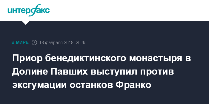 Москва. 18 февраля. INTERFAX.RU - Приор монастыря бенедиктинцев, расположенного на территории мемориального комплекса Долины Павших под Мадридом, Сантьяго Кантера в понедельник выступил против эксгумации тела бывшего руководителя Испании Франсиско Франко.