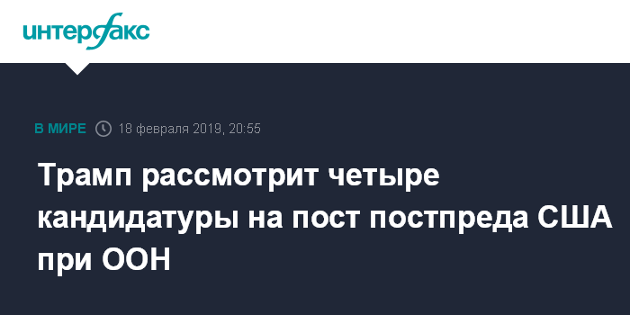 Москва. 18 февраля. INTERFAX.RU - Президент США Дональд Трамп после отказа представителя госдепа Хизер Нойерт занять пост постоянного представителя США при ООН изучает четыре возможных кандидатуры на эту должность. Об этом сообщает в понедельник агентство Bloomberg со ссылкой на неназванный источник.