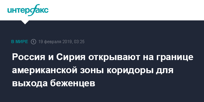 Москва. 19 февраля. INTERFAX.RU - Два гуманитарных коридора для выхода беженцев из лагеря "Рукбан" начнут работать с 09:00 вторника (по московскому времени - ИФ) на границе контролируемой США зоны в Сирии.