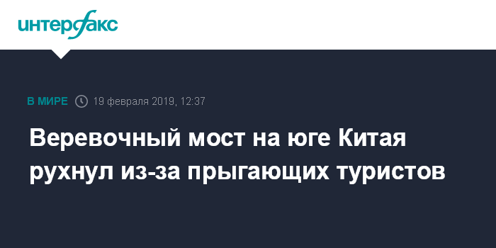 Москва. 19 февраля. INTERFAX.RU - Веревочный мост обрушился в китайской провинции Гуандун вместе с туристами, которые на нем прыгали, сообщает газета The Sun.
