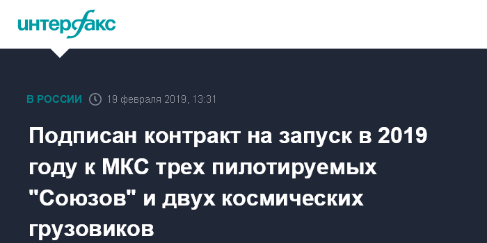 Москва. 19 февраля. INTERFAX.RU - Госкорпорация "Роскосмос" заключила контракт на запуски шести ракет с пилотируемыми и грузовыми кораблями к Международной космической станции (МКС) в 2019-2020 годах, следует из данных системы "СПАРК-Маркетинг".