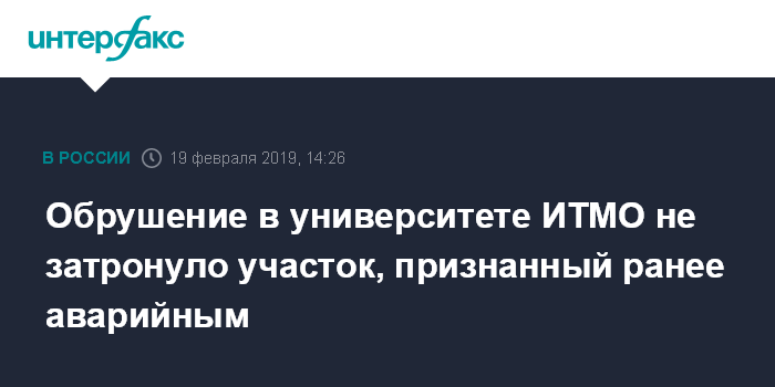 Москва. 19 февраля. INTERFAX.RU - Техническое обследование 2018 года выявило аварийный участок в корпусе университета информационных технологий, механики и оптики (ИТМО), но обрушение произошло в другом месте, сообщил ректор вуза Владимир Васильев.