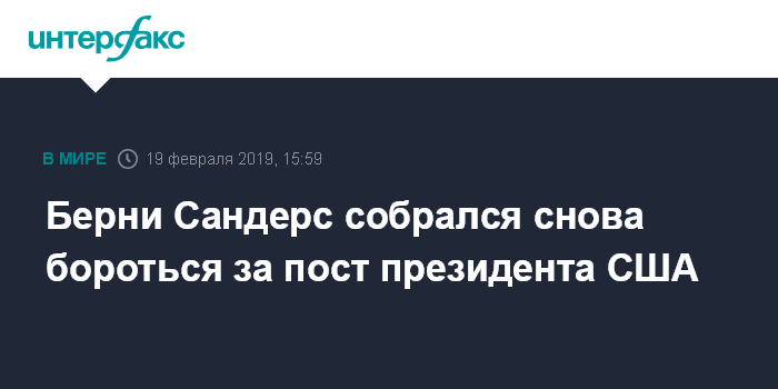 Москва. 19 февраля. INTERFAX.RU - Сенатор от штата Вермонт Берни Сандерс во вторник объявил о намерении вновь баллотироваться на пост президента США на выборах, которые запланированы в 2020 году.