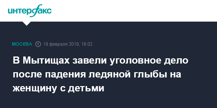Москва. 19 февраля. INTERFAX.RU - Уголовное дело об оказании услуг,не отвечающих требованиям безопасности, возбуждено после падения глыбы льда с крыши мнргоэтажки на женщину с двумя детьми в Подмосковье, сообщила во вторник представитель подмосковного главка СК Ольга Врадий.