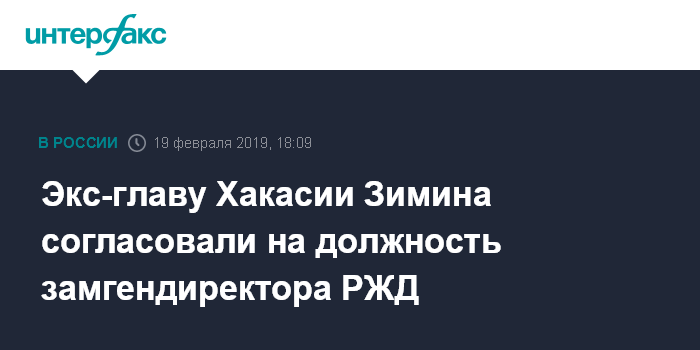 Москва. 19 февраля. INTERFAX.RU - Бывший глава Хакасии Виктор Зимин займет должность заместителя генерального директора ОАО "Российские железные дороги".