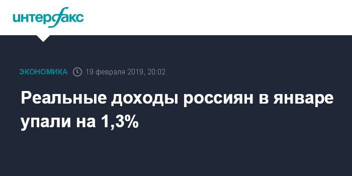 Москва. 19 февраля. INTERFAX.RU - Реальные располагаемые денежные доходы населения РФ в январе 2019 года снизились на 1,3% по сравнению с январем 2018 года после роста на 0,1% в декабре и снижения, согласно уточненным данным, на 4,3% в ноябре, сообщила во вторник Федеральная служба государственной статистики (Росстат).