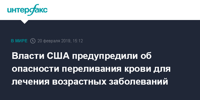 Москва. 20 февраля. INTERFAX.RU - Управление по контролю качества продуктов питания и лекарственных препаратов (FDA) США обнародовало предупреждение, в котором настоятельно рекомендует воздержаться от переливания плазмы крови для лечения связанных с возрастом заболеваний, сообщает The Wall Street Journal.