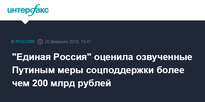 Москва. 20 февраля. INTERFAX.RU - Дополнительные расходы на реализацию мер социальной поддержки, которые озвучил президент РФ Владимир Путин в своем Послании Федеральному собранию, составят свыше 200 млрд рублей, считает секретарь генерального совета "Единой России" Андрей Турчак.