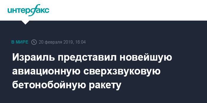 Москва. 20 февраля. INTERFAX.RU - На фоне роста напряженности с Ираном израильский оборонный концерн "Рафаэль" продемонстрировал на авиасалоне AeroIndia в индийском городе Бангалоре новейшую сверхзвуковую бетонобойную ракету класса "воздух-земля", сообщила в среду газета Jerusalem Post.