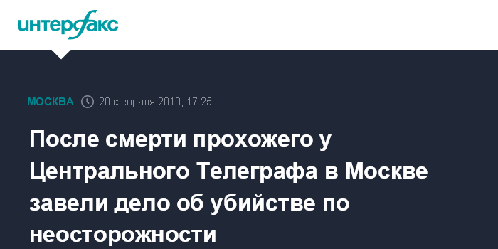 После смерти прохожего у Центрального Телеграфа в Москве завели дело об убийстве по неосторожности