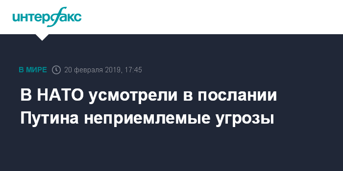 Москва. 20 февраля. INTERFAX.RU - В НАТО осведомлены о заявлениях президента РФ Владимира Путина в связи с ситуацией вокруг Договора о ликвидации ракет средней и меньшей дальности (ДРСМД) и считают угрозы Москвы неприемлемыми, заявил в среду заместитель представителя альянса Пирс Казалет.
