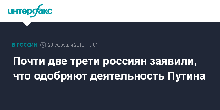 Москва. 20 февраля. INTERFAX.RU - Почти две трети граждан РФ (64%) с одобрением относятся к деятельности президента РФ Владимира Путина, а противоположного мнения придерживается каждый третий россиянин (35%), свидетельствуют данные опроса "Левада-центра", поступившие в "Интерфакс".