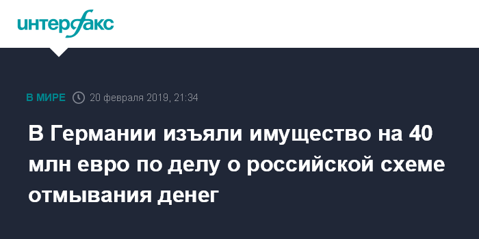 Москва. 20 февраля. INTERFAX.RU - В Германии следователи конфисковали имущество стоимостью 40 млн евро в ходе расследования дела по раскрытию схемы отмывания денег, связанной с Россией, сообщает в среду Associated Press.