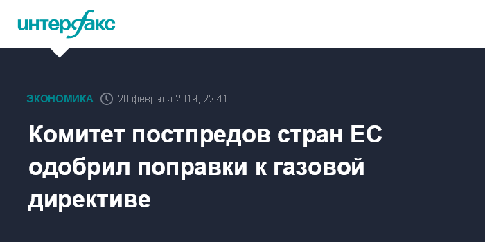 Москва. 20 февраля. INTERFAX.RU - Заседавший в среду в Брюсселе Комитет постоянных представителей государств Евросоюза (Coreper) одобрил ранее согласованные румынским председательством Совета ЕС и Европейским парламентом поправки к европейской газовой директиве, сообщил "Интерфаксу" дипломатический источник в институтах ЕС.
