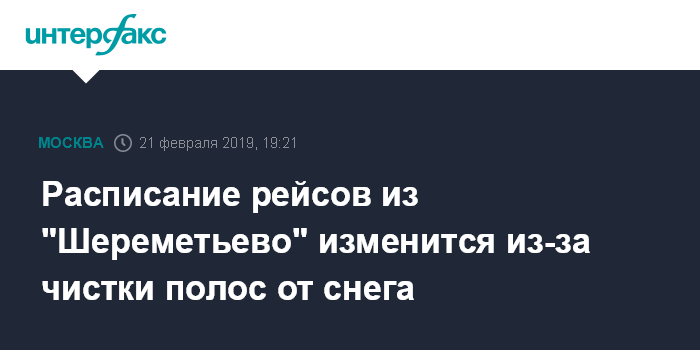 "Просим следить за информацией об изменениях в расписании рейсов "Аэрофлота" 21 февраля. Расписание вскоре будет скорректировано в связи с закрытием взлетно-посадочных полос на чистку в аэропорту "Шереметьево", - говорится в сообщении на сайте перевозчика.